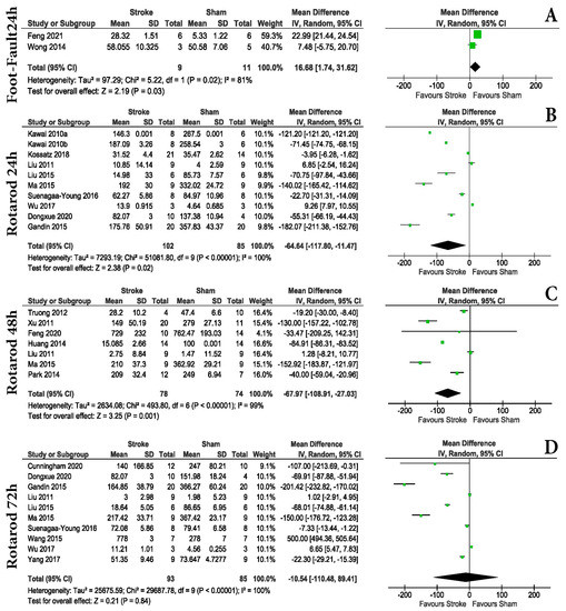 Behavioral testing. In the acute phase within the hyper-acute post-stroke period, the identified motor tests were foot-fault (Supplementary Table S3) and rotarod (Supplementary Table S4). The rotarod [9,10,12,13,14,16,17,31,37,40,45,46,48,49,54,59,62] test was able to distinguish between Sham and MCAo groups within the first: 24 h post-surgery (B) (MD = −64.64 with a 95% CI of −17.80, −11.47, p = 0.02); 48 h post-surgery (C) (MD = −67.97 with a 95% CI of −108.91 to −27.03, p = 0.001); but not at 72 h post-surgery (D) (MD = −10.54 with a 95% CI of −110.48 to 89.41, p = 0.84). The foot-fault [25,26] test showed differences between the groups in the first 72 h after stroke (24 h post-surgery) (A) (MD = 16.68 with a 95% CI of 1.74 to 31.62, p = 0.03), but with a reduced statistical significance compared with the rotarod test, suggesting that the better test for this period is the rotarod test.