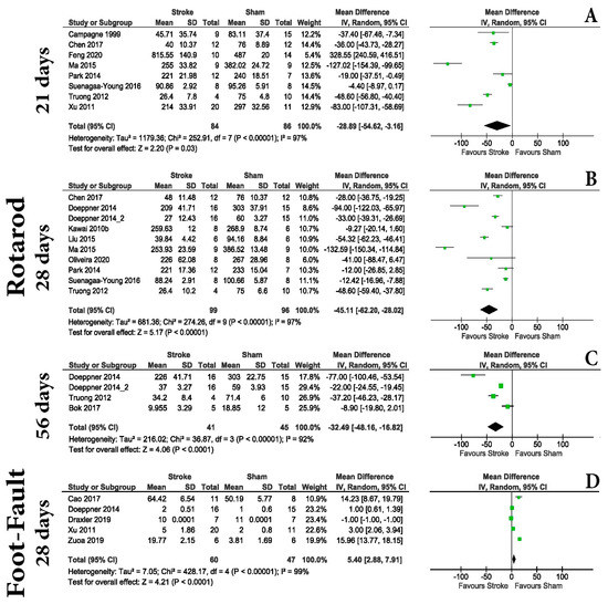For the chronic post-stroke phase, only foot-fault and rotarod tests were found using the included criteria. The rotarod test was able to identify differences between the groups at 21 days (Figure 6A) (MD = −28.89 with a 95% CI of −54.62 to −3.16, p = 0.03), at 28 days (Figure 6B) (MD = −45.11 with a 95% CI of −62.20 to 28.02, p < 0.00001), and 56 days (Figure 6C) (MD = −32.49 with a 95% CI of −48.16, 16.82, p < 0.0001) post-stroke. The foot-fault test was also capable of identifying differences between the groups at 28 days post-stroke (MD = 5.40 with a 95% CI of 2.88 to 7.91, p < 0.0001) (Figure 6D).