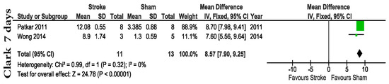 Clark [25,27] neurological scoring represents a better solution for a 7-day post-stroke evaluation (MD = 8.57 with a 95% CI of 7.90 to 9.25, p < 0.0001).