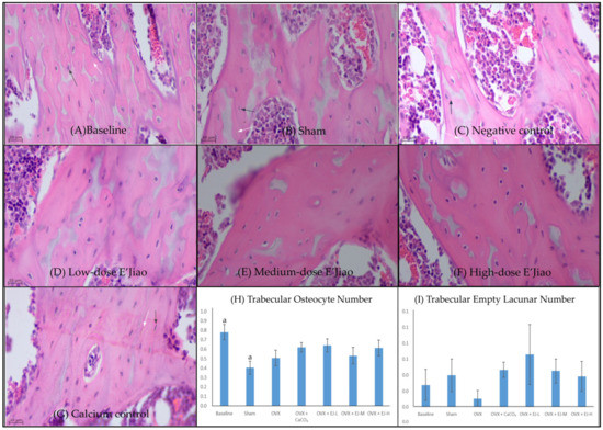 Haematoxylin and eosin-stained femur sections histological slides of trabecular bone (A–G) for quantification of osteocyte number (H) and empty lacunar number (I). The values are expressed as mean ± standard error mean (n = 6 rats in each group). Abbreviations: OVX, Ovariectomy; CaCO3, calcium carbonate; EJ-L, E’Jiao-low dose; EJ-M, E’Jiao-medium dose; EJ-H, E’Jiao-high dose. Notes: The white arrow shows the empty lacunae, while the black arrow shows the osteocytes. The groups sharing the same alphabet are significantly different from each other.