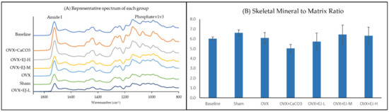 FTIR analysis of mineral/matrix ratio of bone sample from each group. The representative spectrum of each group is shown in (A), while the quantitative comparison of the mineral/matrix ratio among the group is shown in (B). The values are expressed as mean ± standard error mean (n = 6 rats in each group) in (B). Abbreviations: OVX, Ovariectomy; CaCO3, calcium carbonate; EJ-L, E’Jiao-low dose; EJ-M, E’ Jiao-medium dose; EJ-H, E’ Jiao-high dose.