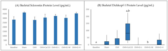 Skeletal sclerostin (A) and Dickkopf-1 protein levels (B) of each group. Skeletal sclerostin protein levels are expressed as mean ± standard error mean (n = 6 rats in each group). Skeletal Dickkopf-1 protein levels are presented in box plots because the data are skewed and analysed using the Kruskal–Wallis test. Abbreviations: OVX, Ovariectomy; CaCO3, calcium carbonate; EJ-L, E’Jiao-low dose; EJ-M, E’ Jiao-medium dose; EJ-H, E’ Jiao-high dose. The groups sharing the same alphabet are significantly different from each other.