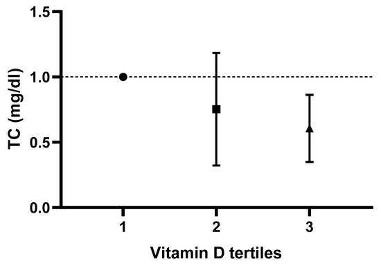 Odds ratios and confidence intervals for total cholesterol (TC) values based on dietary vitamin D (D2 + D3) tertile in the most adjusted model.