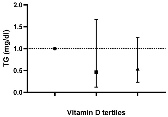 Odds ratios and confidence intervals for triglyceride (TG) values based on dietary vitamin D (D2 + D3) tertiles in the most adjusted model.