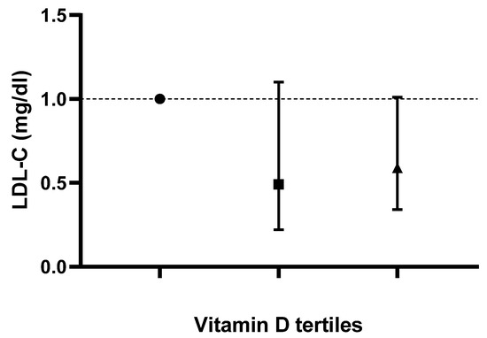 Logistic-regression-adjusted odds ratios for serum lipids’ concentrations based on tertiles of dietary vitamin D intake are displayed in Table 3. After adjusting for age, sex, race, body mass index, serum 25-hydroxyvitamin D2, alcohol intake, energy intake, protein intake, carbohydrate intake, fiber intake and fat intake, individuals in the tertile with the highest versus lowest vitamin D intake (>1 mcg/day vs. <0.10 mcg/day) had lower odds of displaying elevated TC, LDL-C and hs-CRP concentrations (OR 0.57; CI: 0.37 to 0.88; P-trend: 0.045, OR 0.59; CI: 0.34 to 1.01; P-trend: 0.025 and OR 0.67; CI: 0.45 to 0.99; P-trend: 0.048, respectively). Based on the results of the logistic regression, no correlation between vitamin D intake and changes in TG or HDL-C values was noted in any of the models (p > 0.05). Adjusted odds ratios and confidence intervals for TC, TG, LDL-C and HDL-C values based on dietary vitamin D (D2 + D3) tertiles are shown in Figure 1, Figure 2, Figure 3 and Figure 4.
