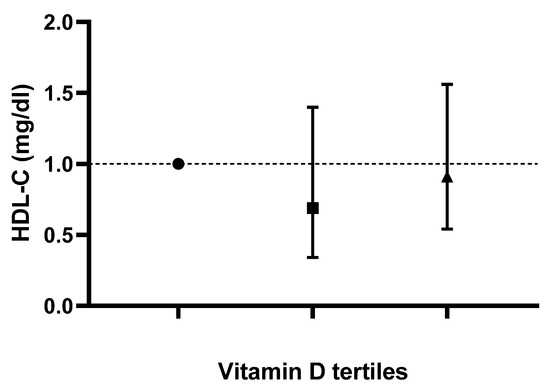Odds ratios and confidence intervals for high density lipoprotein-cholesterol (HDL-C) values based on dietary vitamin D (D2 + D3) tertiles in the most adjusted model.