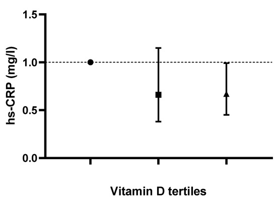 Odds ratios and confidence intervals for high hs-CRP values based on dietary vitamin D (D2 + D3) tertiles.
