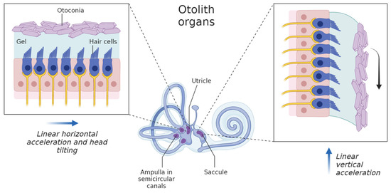 Otolith organs of the vestibular system. The vestibular system is responsible for the body’s equilibrium. It maintains balance and provides awareness of the body’s spatial orientation. The sensory part is located in the inner ear. The two otolithic organs are two patches of hair cells, oriented nearly perpendicular to each other. The saccule rests vertically, whereas the utricle hangs horizontally. The stereocilia of these cells are embedded in a gel-like layer, sprinkled with calcium carbonate crystals called otoconia. The crystals add weight to the layer, pulling it down with gravity. These sensory organs detect not the motion itself, but changes in the rate of motion, specifically acceleration or deceleration (This figure was generated within biorender.com).