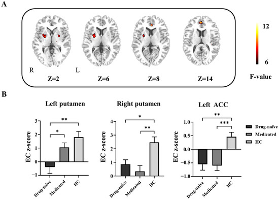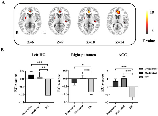 Differences in effective connectivity (EC) from Broca’s area to every whole-brain voxel among the groups. (A) Brain regions with significant group differences according to one-way ANOVA and post hoc analyses. R, right; L, left. (B) Bar graph showing the ROI-wise post hoc analysis results. * p < 0.05; ** p < 0.01; *** p < 0.001. HG, Heschl’s gyrus; ACC, anterior cingulate cortex; drug-naïve, unmedicated benign epilepsy with centrotemporal spikes; medicated, medicated benign epilepsy with centrotemporal spikes; HC, healthy control group.