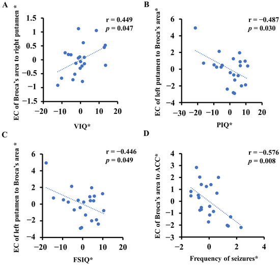 Correlations between clinical features and abnormal effective connectivity (EC) in the drug-naïve group (unmedicated benign epilepsy with centrotemporal spikes). Asterisks (*) indicate residuals of the linear regression model controlling for both age and sex. (A) The EC of Broca’s area to the right putamen showed significantly positive correlations with VIQ (verbal intelligence quotient). (B) The EC from the left putamen to Broca’s area showed significantly negative correlations with PIQ (performance intelligence quotient). (C) The EC from the left putamen to Broca’s area showed significantly negative correlations with FSIQ (full-scale intelligence quotient). (D) The EC of Broca’s area to the ACC showed significantly negative correlations with the frequency of seizures. ACC, anterior cingulate cortex.