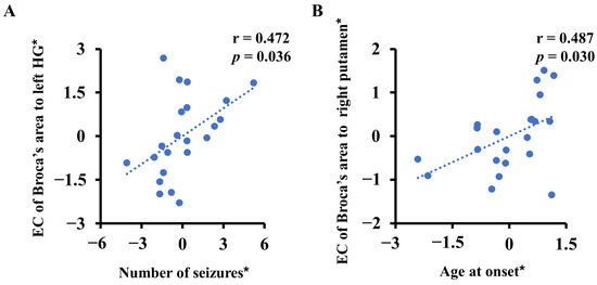 In the medicated group, the EC from Broca’s area to the left HG was positively related to the number of seizures (r = 0.472, p = 0.036) (Figure 4A). The EC from Broca’s area to the right putamen was significantly positively correlated with the age at onset (r = 0.487, p = 0.030) (Figure 4B). The other variables (VIQ, PIQ, age, disease duration and frequency of seizures) were not significantly correlated with abnormal EC values at p > 0.05.