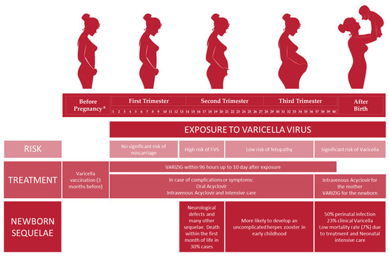 In fact, during the viremia period with active vesicles, the delivery also carries a high risk of maternal hemorrhage and coagulopathy due to thrombocytopenia or hepatitis and a high risk of severe neonatal varicella. According to current recommendations, VARIZIG should be given to all infants born from mothers who have been affected by chickenpox from 7 days before to 7 days after delivery [3,44]; although VARIZIG does not prevent infection, it could reduce symptoms and disease severity. If the newborn develops varicella despite VARIZIG treatment, they should be administered intravenous acyclovir [45] (Figure 1).