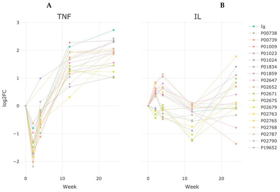 Dynamics of semiquantitative changes in the proteome of patients in the anti-αTNF (A) group and in the group with anti-IL6 (B) therapy during 24 weeks of treatment to baseline values before the start of therapy. The log2FC values for Ig reflect the fraction of proteins of the immunoglobulin class. Log2FC is calculated as a ratio of the median of Ig-proteins quantity toward its quantity at the initial point (before the starting treatment).