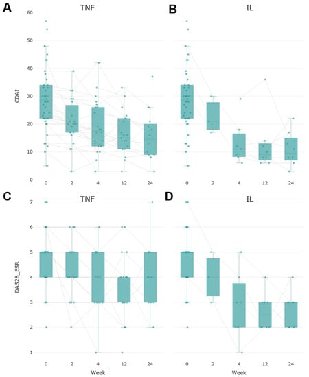 Change in clinical ΔCDAI in the group of patients with anti-αTNF (A) and anti-IL6 therapy (B) and ΔDAS28-ESR in the group of patients with anti-αTNF (C) and anti-IL6 (D) therapy for 24-x weeks of treatment. DAS28-ESR is used to determine eligibility for biologic therapies. DAS28-ESR ≥ 3.2 can be used as a threshold for classifying active RA.