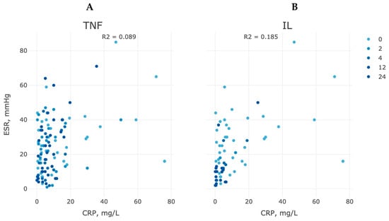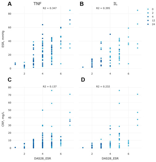 As DAS29 versions (ESR or CRP) were not interchangeable and often debatable in their discrepancy, we considered ESR vs. CRP separately for both types of therapy at the end of the study. The decrease in CRP levels with the ESR can, thus, strongly indicate the effectiveness of therapeutic treatment (Figure 4). Both groups of the study demonstrated a high proportion of patients with lowering CRP at week 24, which agreed with the DAS28-CRP version, but the group of anti-TNF therapy shared a denser proportion of patients (up to 70%) with a high ESR indicator (>10 mm/h) with a comparable value to anti-IL-6 CRP values.