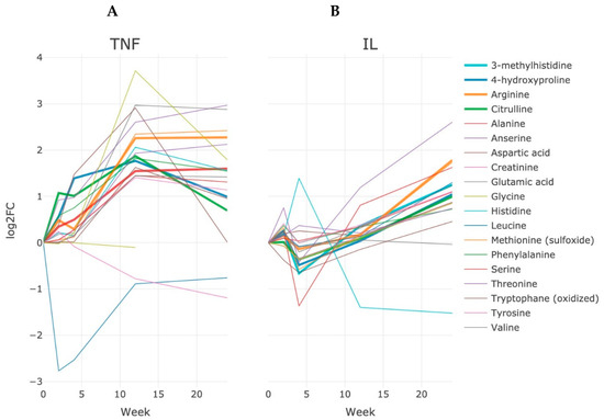 Dynamics of changes in endogenous metabolites during a 24-week course of treatment among patients in the anti-αTNF (A) and ani-IL6 (B) groups of therapy. The Log2FC value is calculated as a median quantity of a certain metabolite toward its quantity at the initial (before starting treatment) point of treatment.