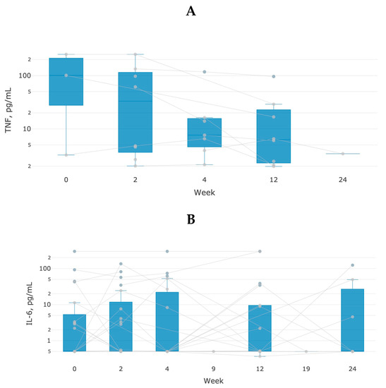 Dynamics of changes in the content of TNF (A) and IL6 (B) in blood samples of patients with anti-αTNF therapy. The measurements were performed by the ELISA method (Alfa-TNF-IFA-BEST and IL-6-IFA-BEST, Vector Best, Novosibirsk, Russia) in three technical repetitions.
