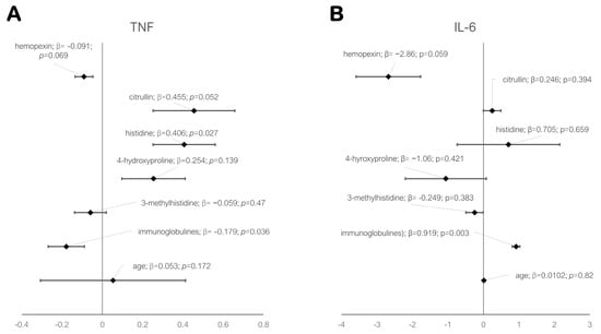 In order to determine significant indicators reflecting a positive response to therapy among patients, we tested by creating a multivariate regression model in which indicators such as 4-HP, 3-MH, hemopexin, total immunoglobulin fraction, citrulline, and arginine were tested in pairs, as well as the age factor (Figure 7). Adjustment for the significance of multiple testing was performed using the Bonferroni adjustment. Immunoglobulins (statistically significant, p = 0.036 for the anti-αTNF group and p = 0.003 for the anti-IL6 group) were positively associated with the effective treatment outcome in both study groups (Figure 7), indicating the reactivity of the immune system regardless of the chosen treatment scheme, as well as the generalized positive dynamics of the patients’ condition by the 24th week of treatment.