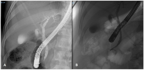 ERCP image of the calculus identified by EUS and of the distal common bile duct stenosis (A) through which a plastic stent was inserted (B).