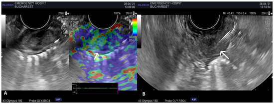 (A) EUS image revealing a submucosal lesion in the second part of the duodenum, mixed at elastography (arrow-mixed pattern of the lesion). (B) EUS guided-biopsy through EUS-FNB (arrow-needle inside the lesion).