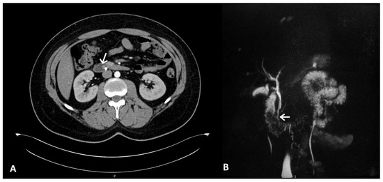 CT (A) and MRI (B) aspects of the patient in the presurgical step. Arrow—duodenal location of the tumor.
