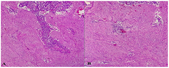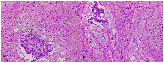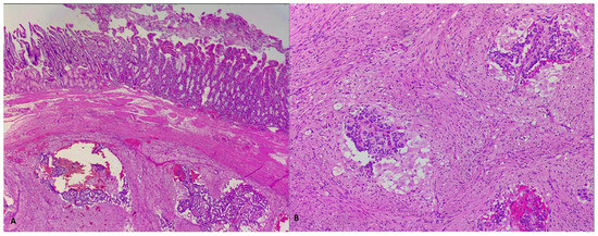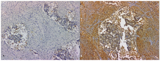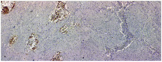 A morphological analysis showed cells with hyperchromic nuclei, elongated, spindle-like or round-oval in shape, with a low cytoplasmic volume, alternating with cells with vesicular nuclei and a high-volume, clear, granular cytoplasm. Lymphoid tissue was present in an intertwined fashion with the tumoral tissue (Figure 13). Necrotic tissue was absent, and a low mitotic activity was observed. Immunostaining revealed positivity for synaptophisin, chromogranin, AE1/AE3. CDx2 staining was negative. The Ki67 score was positive in a mere 1–2% of the cells.