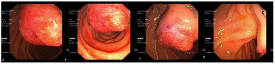 The third patient was a 41-year-old male, without any relevant medical history outside of obesity class 1 and essential hypertension, presenting to endoscopic evaluation for symptomatic reflux disease and abdominal pain. The blood tests only showed a slightly elevated creatininemia and minimal anemia, with no other pathological changes, including tumoral markers detection. The Helicobacter pylori stool antigen test rendered a positive result. Abdominal ultrasound scanning yielded normal results. At first, the patient underwent endoscopy by means of a standard frontal-viewing endoscope and, a 4 mm sessile polyp Paris Is was identified in the bulbar area, close to the pyloric orifice, hidden by the posterior sphincterian wall (Figure 11). Biopsies were taken, but the histopathological studies yielded no relevant result, outside of the presence of a chronic inflammatory infiltrate, without any dysplastic or neoplastic cells. Also MRI did not identify the duodenal nodule but issued images of enlarged hepatic hilar and retropancreatic lymphadenopathies, with somewhat significance in the context.