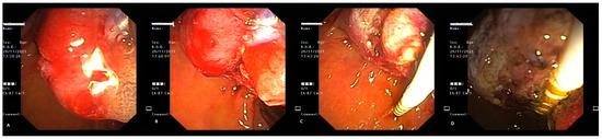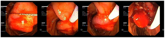 The second patient was a 43-year-old male, with a medical history of primary arterial hypertension and obesity class 1, referred to our Emergency Unit for black, tarry stools, known as melena, suggestive of upper gastrointestinal bleeding, epigastric pain, hypotension and asthenia. These symptoms started 7 days before presentation. Biologically, a hemoglobin value as low as 5 g per deciliter was detected. The patient was hemodynamically stabilized with blood transfusions and plasma expanders and also received high-dose proton pump inhibitor therapy. An upper gastrointestinal endoscopy was performed, and in the second part of the duodenum, in the nearby vicinity of the major and minor duodenal papilla, an extramucosal, ulcerated, polipoid lesion of about 20/15 mm was noted, with a hematic clot covering the ulcer base and a diffuse slow hemorrhage noted at the clot’s extremities. At first, hemostasis was conducted by perilesionally injecting 20 mL of adrenaline 1:10,000. After this, we performed a CT exam that excluded the possible local or distant spread of the tumor. The next day, the upper endoscopy by means of a side-viewing duodenoscope was repeated with the intention to remove the tumor (Figure 6).