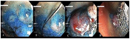 Endoscopic mixed hemostasis for the endoscopic resection site: injection of adrenaline 1:10,000 (A,B) and bipolar hemostasis (C,D).