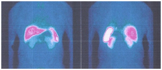 Outside of the persistent abdominal pain, which seemed to be functional, another persistent feature, important in the context, was the continuation of arterial hypertension at a certain degree; so our patient was sent for Holter monitoring of blood pressure for 24 h, which showed a range of systolic blood pressure of 113–144 mmHg and a range of diastolic blood pressure of 65–101 mmHg. The patient was prescribed a calcium channel blocker and sent for continuation of investigations. Serum chromogranin A, gastrin or serotonin (5-hydroxytryptamine) and urinary catecholamines, vanillylmandelic acid or 5-hydroxyindoleacetic acid were tested and yielded normal results. Later on, even positron emission tomography (PET) with radiolabeled somatostatin analogs and a neuroendocrine tumor protocol were carried out, with no gastro–duodenal, bilio–hepato–pancreatic, retroperitoneal or adenopathic anomalies detected (Figure 14).