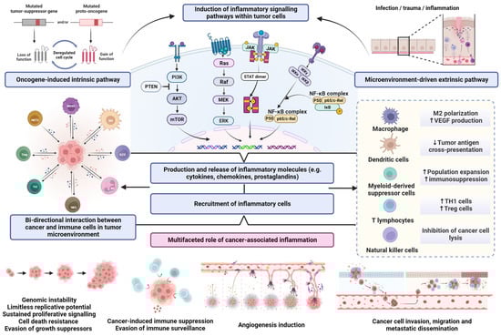 Acute and properly resolved inflammation is a fundamental response to adverse stimuli and is generally beneficial for the host. In contrast, there is accumulating scientific evidence that chronic, persistent, and deregulated inflammation induced by biological, chemical, or physical factors predisposes risk to various types of malignancies []. Sustained inflammatory processes mediate the disruption of cellular homeostasis, facilitate genomic instability, stimulate DNA damage and resistance to apoptosis, suppress antitumor immunity, and promote angiogenesis and the formation of metastatic colonies []. Furthermore, inflammatory cells and mediators are present in the majority of neoplastic tissues, even in those where chronic inflammation was not causatively involved in tumorigenesis []. Thus, the bidirectional interaction between inflammation and neoplastic transformation and progression includes both oncogene-induced intrinsic pathways and microenvironment-driven extrinsic pathways []. In the oncogene-driven pathway, genetic alterations that promote neoplastic transformation also contribute to the development of inflammatory milieu and coordinate the activation and action of specific mediators. Conversely, in the extrinsic pathway, tissue conditions caused by inflammation mediate the continuous phenotypic and functional perturbations within tumor-permissive microenvironments, enabling cell proliferation, neovascularization, and the evasion of immune surveillance, thus supporting malignancy onset and further cancer progression [,]. Aberrant tissue homeostasis, coupled with amplified inflammatory signaling, metabolic alterations, and functional adaptations of cancer cells, triggers and invigorates myriad survival pathways, mediating cellular transition towards limitless proliferative potential, the avoidance of immune surveillance mechanisms, and invasiveness [,] (Figure 1).