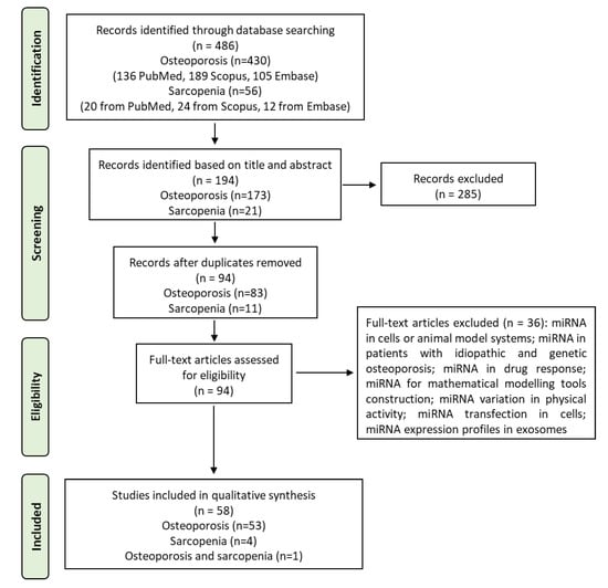 Our literature review involved a systematic search conducted in January 2023. We performed our review according to the Preferred Reporting Items for Systematic Reviews and Meta-Analyses (PRISMA) statement [24]. The search was carried out on three databases: PubMed, Scopus, and Embase. The following combination of terms was used: (osteoporosis) AND ((serum miR) OR (circulating miR)) and (sarcopenia) AND ((serum miR) OR (circulating miR)); for each of these terms, free words, and controlled vocabulary specific to each bibliographic database were combined using the operator “OR”. The combination of free-vocabulary and/or Medical Subject Headings (MeSH) terms for the identification of studies in PubMed, Scopus, and Embase are reported in Table 1.
