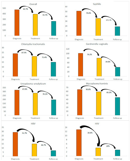 Seven-hundred-nineteen cervical swabs, 958 syphilis, 953 HIV, 936 HCV, and 938 HBV screenings were performed. Overall, 474 (45.8%) episodes resulted in the isolation of at least one pathogen. Three-hundred-ninety-two/474 (82.7%) patients came back to start therapy, and 264/474 (55.7%) complied with follow-up (Figure 1). Overall, the most common diagnosis was U. urealyticum (n = 320, 30.9%), followed by G. vaginalis (n = 101, 9.8%), M. hominis (n = 65, 6.3%) and syphilis (n = 51, 4.9%). Regarding viruses, HBV was the most common (n = 29, 2.8%), followed by HIV (n = 13, 1.3%). Of interest, only 51.5% of HBV and nearly 30.8% of HIV diagnoses were linked to care. The cascade of care for each diagnosis is shown in Figure 1.