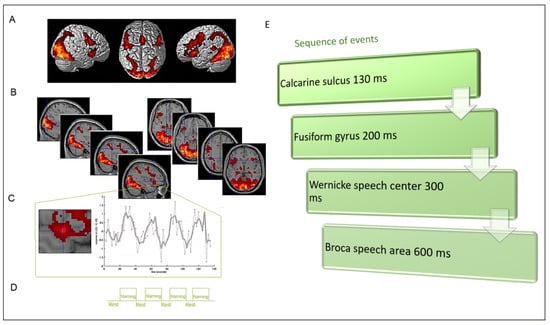 Example of spatial and temporal information provided by fMRI and MEG during a representative task (i.e., object naming) in pre-operative mapping. (A) fMRI functional overlay on a glass brain, providing the entire naming-related network (data from our lab, acquired by a 3 T tomograph). (B) Same fMRI activations overlaid on sagittal and axial structural images (note the relevant nodes represented by the calcarine cortex, fusiform gyrus, Wernicke’s, and Broca’s areas); these images can provide a hint on the distance between the activation center of mass and potential lesions. (C,D) Detail of one activation cluster (high-field scanners allow the acquisition of images at high spatial resolution) and related averaged fMRI signal, resulting from the overall activation across several task repetitions (i.e., blocks) throughout the whole task presentation. (E) Temporal fingerprints of the object-naming task, provided by MEG high temporal resolution (data from Grummich et al., 2006); temporal information can be relevant for planning the proper delay after stimulus presentation to be used during intra-operative stimulation mapping.