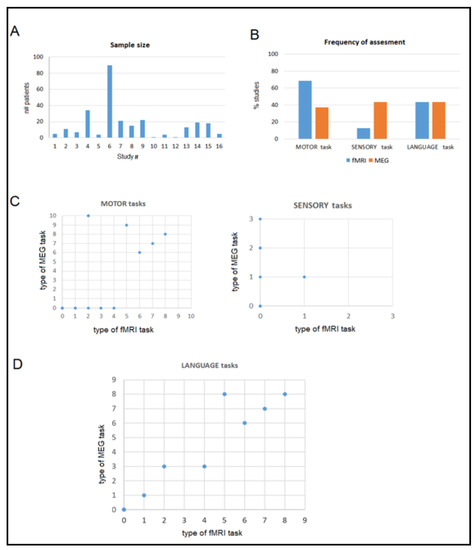 Patients and tasks of the selected studies. (A) The number of patients involved in each selected study. (B) The percentage of studies that investigated the motor, sensory, and language functions by fMRI and MEG. (C,D) The correspondence between fMRI and MEG concerning the adopted task/stimulation, respectively for the motor and sensory function and for the language function (same number is attributed to same task or group of tasks across the studies).