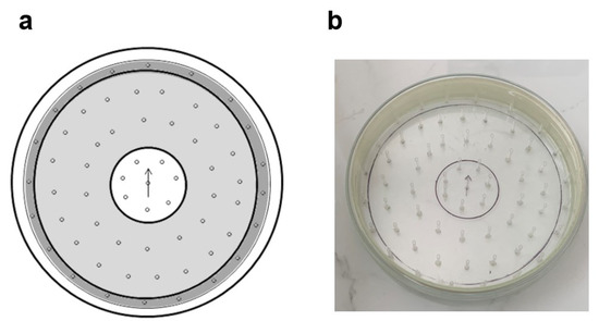 Multirod arena (MA). (a) ◦—skewed rods (glass capillaries); white—center with arrow determining the orientation of the slope of the skewed rods; light gray—internal; dark gray—border. (b) Photo of the MA.