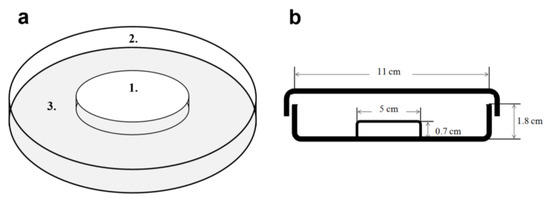 Hydration arena (a): 4.5 cm-diameter glass Petri dish (1) placed upside-down in a larger (11 cm-diameter) Petri dish (2) containing a wet filter paper (3) and covered with the glass lid. (b): Side view.