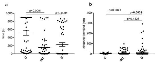During recording time (the first 15 min), the ticks spent most of the time in C compared to INT (p < 0.0001) and B (p < 0.0001); H3216 = 99.15, p < 0.0001. We obtained similar results when we evaluated the time spent in individual parts of the apparatus by active ticks only; H3153 = 43.02, p < 0.0001 (Figure 4a).