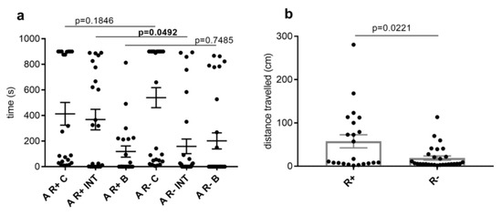The time spent in the individual parts of the MA by ticks did not differ significantly. However, when comparing the time spent in the parts of the apparatus only in Rickettsia-infected and uninfected ticks, which were active in locomotion, a significant difference was observed. Infected ticks spent significantly more time than uninfected ticks (p = 0.0492) in INT (Figure 5a).