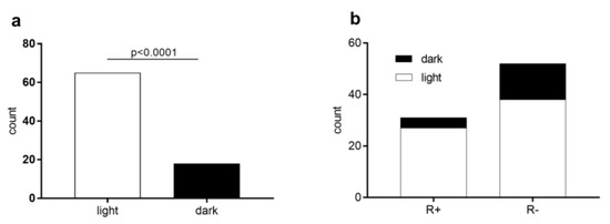 The majority of ticks (65 of 88) preferred the light part of the apparatus: χ2 = 2171, 2 df, p < 0.0001 (Figure 6a). Rickettsia-positive and Rickettsia-negative ticks evaluated separately also had significant preference for the light part (p < 0.0001). Since five ticks were found on the border, they were excluded from the statistic. We did not record any significant difference in the light/dark preference in Rickettsia-positive vs. Rickettsia-negative ticks: χ2 = 2.248, 1 df, p = 0.1338 (Figure 6b).