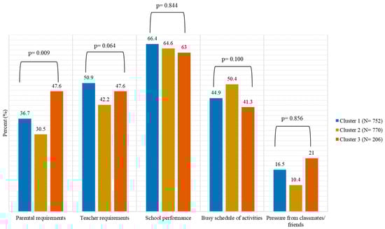 3.3. Prevalence of Stress and Its Main Sources According to Children’s Activity-Related Patterns