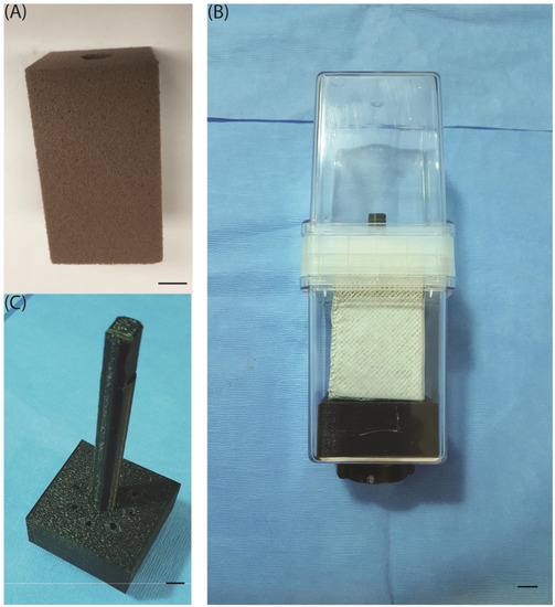 The APEX Growth Unit hardware. (A) The central Oasis Hortcube foam block (LC2, Oasis Grower Solutions) is used as a seed support during takeoff as well as following germination. It also serves as a nutrient reservoir during seedling growth. (B) The fully assembled APEX Growth Unit contains a foam block wrapped with a layer of medical gauze, allowing a more homogenous distribution of growth medium at the surface of the block where germinating seedlings are located. An outer layer of Nitex mesh prevents the roots of germinating seedlings from penetrating into the foam block, thereby hindering observation of their growth. (C) A growth-medium injection showerhead carries a central stick that serves as a support for a foam cube within the Magenta box. The injection showerhead is accessible for nutrient injection into the foam block through a port that crosses the Magenta box wall at its bottom. Black lines refer to 1 cm.