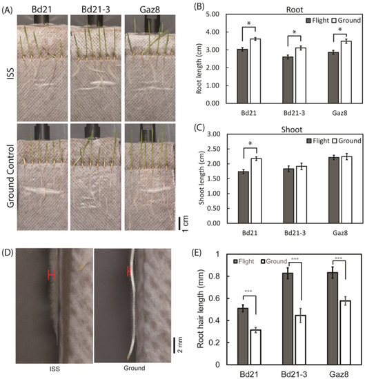 Brachypodium distachyon seedlings display accession-specific morphological alterations in the microgravity environment of ISS relative to ground controls. Accessions include Bd21, Bd21-3, and Gaz8. (A) Representative 5-day-old Brachypodium seedlings of the Bd21, Bd21-3, and Gaz8 accessions grown on the ISS (upper panel) and on Earth (lower) panel). Biometric analysis of (B) root length and (C) shoot length of 5-day-old Brachypodium distachyon seedlings from the Bd21 (n > 69), Bd21-3 (n > 68), and Gaz8 (n > 68) accessions. (D) Close-up view of representative roots of 5-day-old Gaz8 seedlings, showing differences in root-hair lengths between microgravity-exposed (left) and ground-control (right) seedlings. Representative root-hair length measurement is marked in the red line. (E) Quantitative measurement of root hair sizes between microgravity-grown and ground-control 5-day-old seedlings from the Bd21, Bd21-3, and Gaz8 accessions. Based on the resolution of the images, each root was measured once in the root mature zone from the root hair tip to the approximate root epidermal layer (n > 10). In B, C, and E, t-tests were used to determine the significance (* p < 0.05; *** p < 0.001; n > 10).