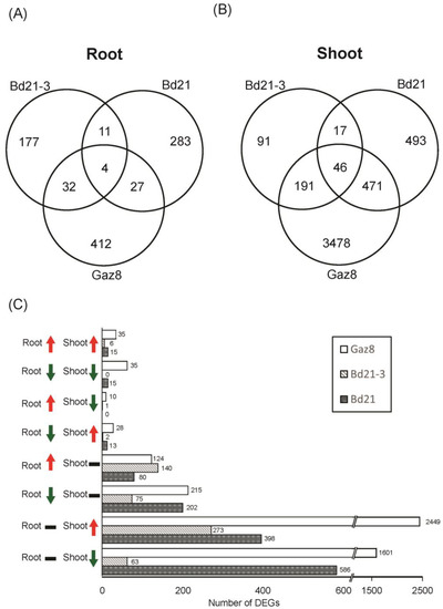 Within each accession, very few DEGs were found to overlap between shoots and roots. In fact, a vast majority of DEGs were differentially expressed in only shoots or roots (Figure 3C). This observation held true for all accessions tested in this study.