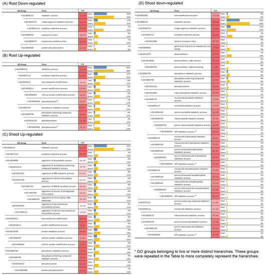 Gene Ontology (GO) enrichment analysis of DEGs from 5-day-old Brachypodium distachyon seedlings of the Bd21 accession exposed to microgravity conditions of ISS relative to ground-control conditions. All DEGs from Bd21 are split into four categories based on tissue (root/shoot) and expression regulation under microgravity relative to ground control (up/down): (A) root down-regulated DEGs, (B) root up-regulated DEGs, (C) shoot down-regulated DEGs, and (D) shoot up-regulated DEGs. Enrichment significance is represented by both FDR numbers and color shading, with darker red representing smaller FDR values. Blue bars represent expected values (total number of genes representing the GO group divided by the total number of genes in the genome), whereas yellow bars represent observed ratios (number of DEGs belonging to the GO group divided by the total number of DEGs). The GO groups are arranged along a hierarchical tree of biological processes. The original information was generated by using the agriGO website (http://bioinfo.cau.edu.cn/agriGO/ (accessed on 6 February 2023)). The singular enrichment analysis (SEA) method was used to calculate significance. * refers to the GO groups that belong to two or more different hierarchies and are repeated in the table to better represent the hierarchies.