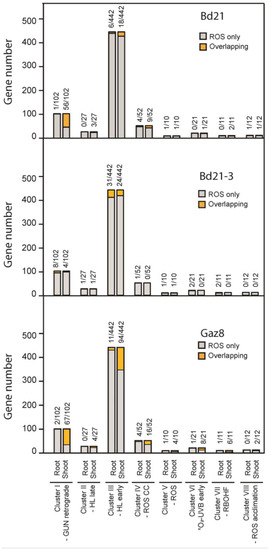 As mentioned in the previous sections, the oxidation-reduction process is important for Brachypodium seedlings growing under microgravity condition. When we compared the ROS wheel with our DEG lists, cluster I from the ROS wheel was significantly enriched within the Bd21 and Gaz8 shoot DEGs (Figure 5). Cluster I is enriched with photosynthesis-related genes [43]. Therefore, these results match our observation that Bd21 and Gaz8 shoot down-regulated DEGs are enriched with photosynthesis-related GO groups (GO.: 0015979, GO: 0019684, GO:0006091) (Supplemental Figure S4). This observation is also consistent with previous reports from Arabidopsis [50,55] and rice [31].