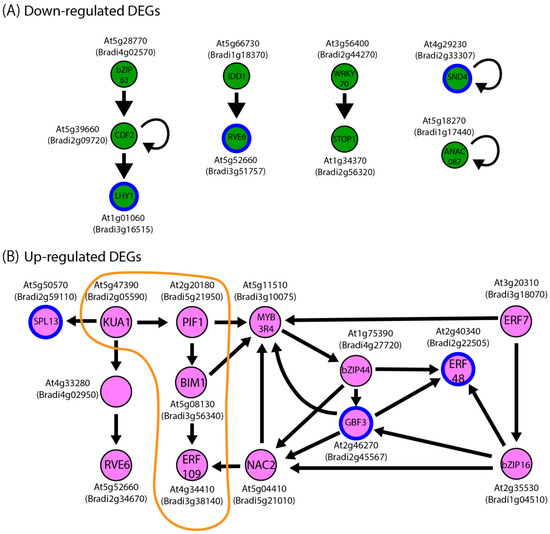 In the Arabidopsis genome, a total of 252 genes are annotated as associated with the photosynthesis GO group (GO:0015979). Among them, 99 were orthologous to genes within our DEG list. We used these 99 DEG orthologs as input to retrieve 29 candidate transcription factors that are predicted to regulate these DEGs in Arabidopsis. Brachypodium orthologs to these candidate regulatory transcription factor genes were then identified and compared to our list of DEGs in the Bd21 accession (Supplemental Table S10). This analysis allowed us to build the predicted regulatory networks connecting transcription factor genes associated with photosynthesis-related Bd21-DEG orthologs in Arabidopsis thaliana (Figure 6). Several short linear pathways were identified amongst the dow-regulated DEG orthologs (Figure 6A). On the other end, a more complex, branched regulatory network could be built connecting numerous up-regulated DEG orthologs (Figure 6B). Within this up-regulated network, one pathway has been more thoroughly investigated in Arabidopsis thaliana, involving the PHYTOCHROME-INTERACTING FACTOR1 (PIF1, also named PHYTOCHROME-INTERACTING FACTOR3-LIKE5; PIL5; At2g20180/Bradi5g21950) (Supplemental Figure S6, surrounded by an orange line). This transcription factor preferentially interacts with the Pfr forms of Phytochrome A (PhyA) and Phytochrome B (PhyB) to modulate light effects in plants. Interestingly, the Phytochrome A (PHYA; Bradi1g10520) was also up-regulated in response to the microgravity environment in Brachypodium Bd21 shoots (Supplemental Table S2). Furthermore, up-regulation of PIF1 was previously reported to inhibit photomorphogenesis-related processes in several plant species, including chlorophyll biosynthesis and photosynthesis in Arabidopsis [56,57,58,59].
