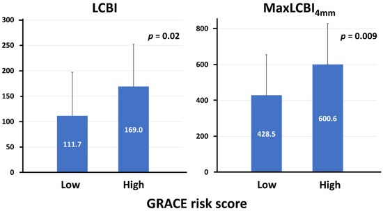 The present study demonstrated that the GRACE risk score was positively correlated with LCBI and maxLCBI4mm and that LCBI and maxLCBI4mm in the target vessel were significantly higher in the high GRACE risk score group than their counterpart. In addition, LCBI and maxLCBI4mm in the target vessel was significantly predictive for MACE, and patients with the high GRACE score and high LCBI and maxLCBI4mm were at an increased risk of subsequent ischemic events.