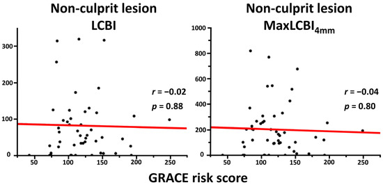 Figure 5. Correlation between GRACE risk score and LCBI or maxLCBI4mm in patients with non-ST segment elevation myocardial infarction. LCBI, lipid core burden index; maxLCBI4mm, maximum lipid core burden index in 4 mm.