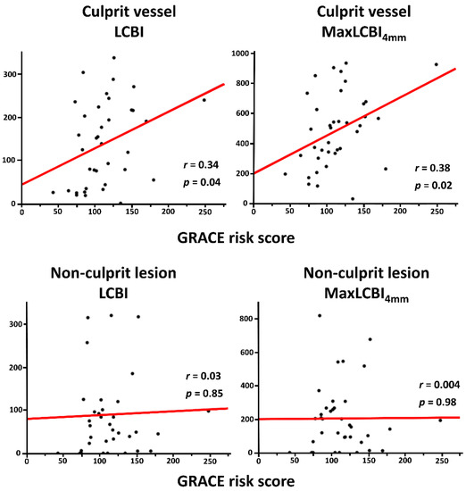 Some limitations to our study should be acknowledged. This was a single-center study, and the analysis was performed in a post-hoc manner despite the prospective design. Because of the small sample size and modest correlations of GRACE risk score with LCBI and maxLCBI4mm, the present study results should be considered hypothesis-generating. Multivariable analysis seemed useful to determine the effect of GRACE risk score on coronary plaque vulnerability beyond age, chronic kidney disease, and anemia, all of which are a surrogate of frailty and were significantly more prevalent in patients with high GRACE score (Table 1). However, the small sample size precluded multivariable adjustment and the analysis on incremental prognostic values of LCBI and maxLCBI4mm compared to the GRACE risk score alone. Because NIRS-IVUS system has a relatively large profile and its use was left to operators’ discretion, the present study population may represent a low-risk population without severe calcification and tortuosity, namely a selection bias [47]. Although NIRS-IVUS was used in all patients, the impact of other modalities evaluating coronary plaque morphology (e.g., optical coherence tomography) is unknown [48,49]. In this study, the significant relation of GRACE risk score to LCBI or maxLCBI4mm were observed in the entire culprit vessel, whereas the relationship was unclear in the nonculprit lesion. Given that the prognostic ability of NIRS-IVUS with LCBI or maxLCBI4mm has been extensively investigated in previous studies in those in nonculprit segments [20,21], the present study results should be interpreted with caution. Although the large-scale subanalysis of COLOR registry showed that pre-PCI LCBI in the culprit lesion was not significantly associated with subsequent culprit lesion-related events after PCI, the relation of culprit lesion LCBI to nonculprit lesion related events and other clinical outcomes remains unclear [50]. We believe that future studies addressing the prognostic impact of LCBI and maxLCBI4mm in the culprit lesion and the relation of GRACE risk score to coronary plaque vulnerability in the nonculprit segment are warranted.